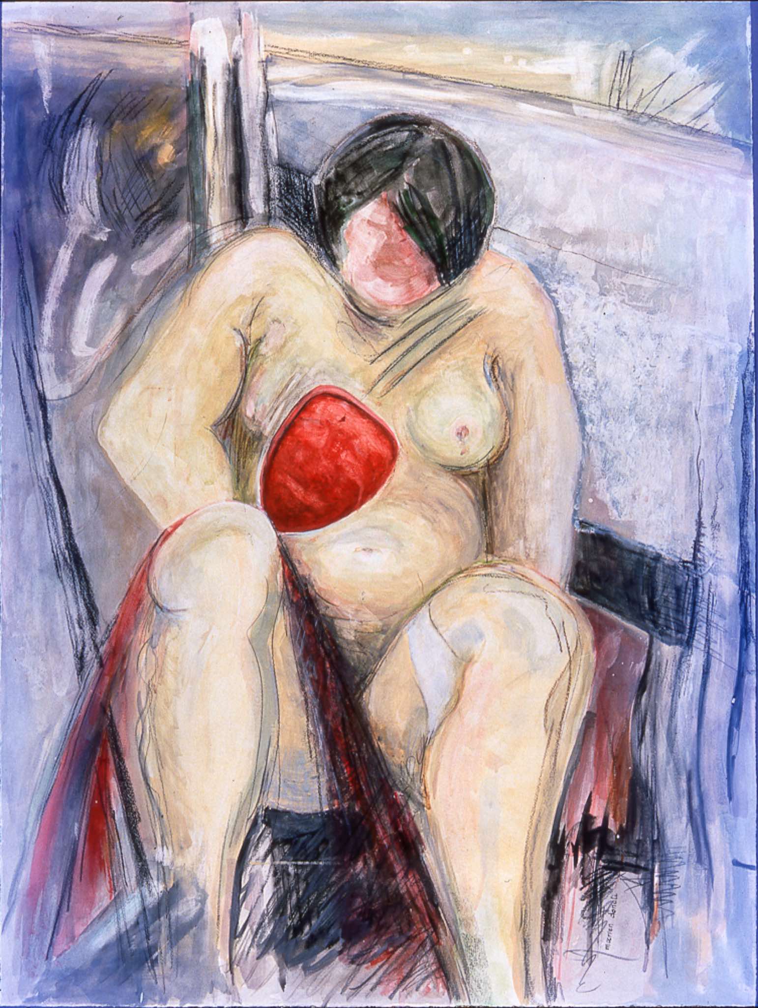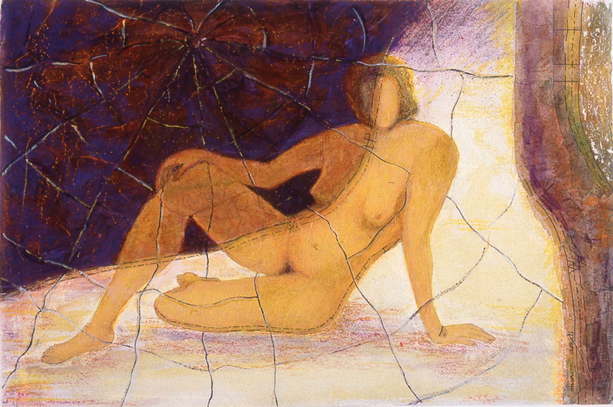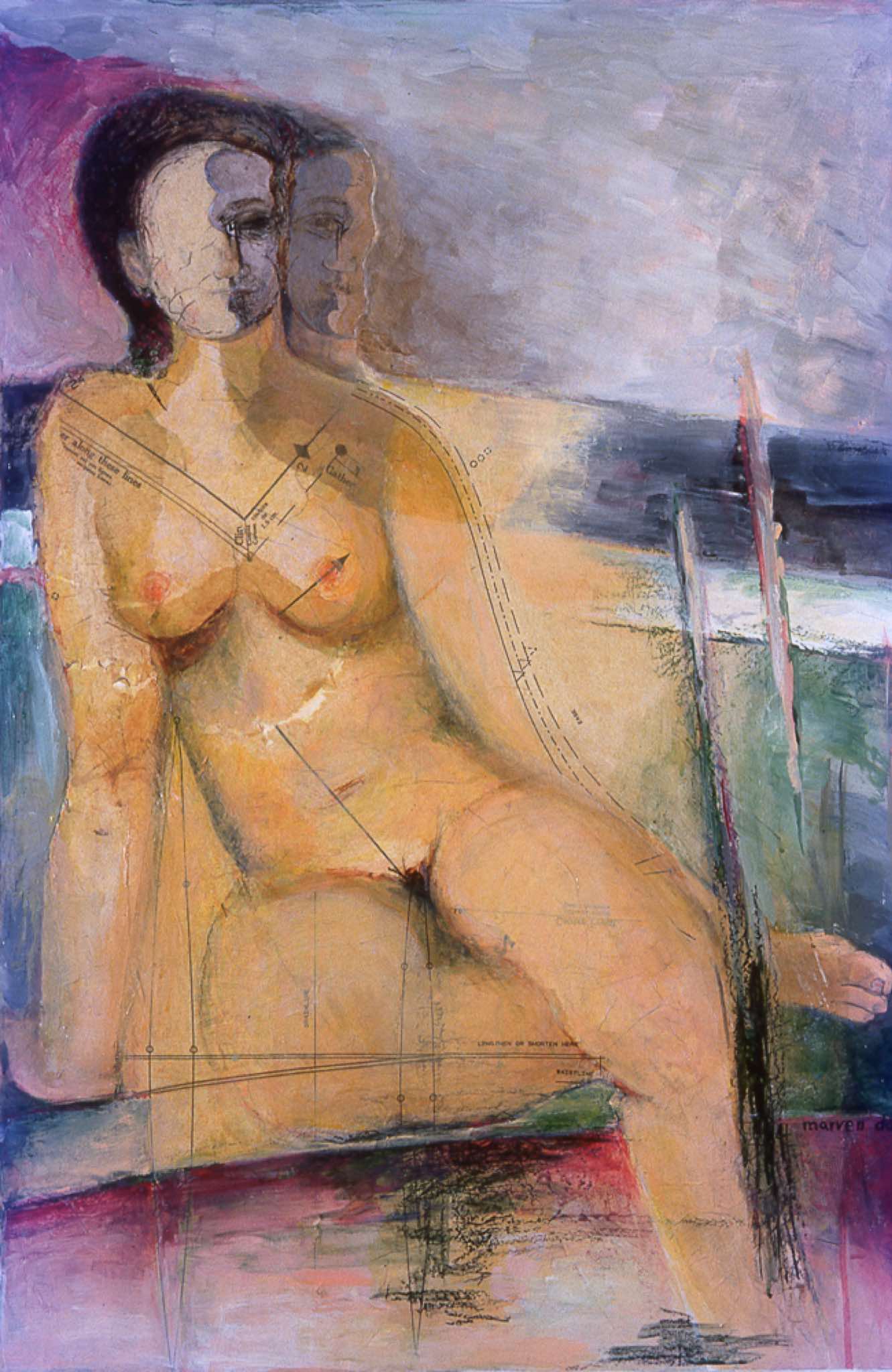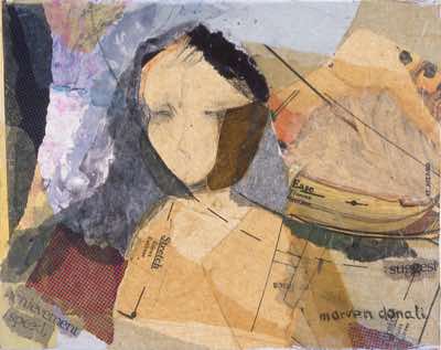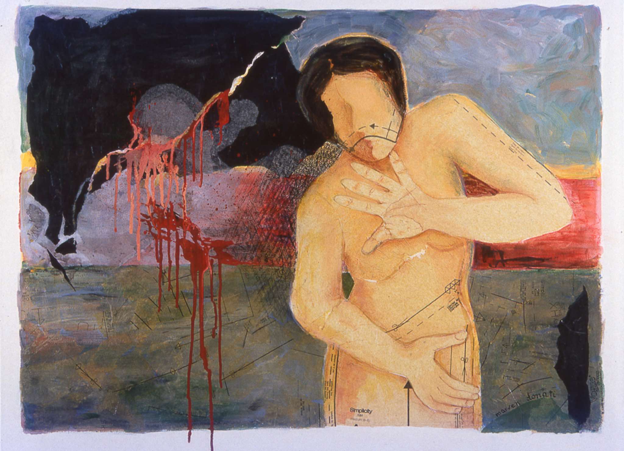 In my series Pattern Shifts (1998-2000), I use the female body as the vehicle to explore the human condition – joy, sensuality, loneliness, despair, and the violence that permeates our society. On these predominantly acrylic works on rag paper, I introduced areas of collaged dressmakers’ patterns to form some of the bodies. Symbolically, the dressmakers’ patterns represent the lives we fall into, patterns that measure and define us with clear cutting lines. Paradoxically, an individual may be caught in a struggle to overcome patterns (often imposed by society), while at the same time yearning to remain in place in a pattern of familiarity and safety. The delicate pattern tissue is in itself is a reminder of the fragility of human beings and the frailty of desires.